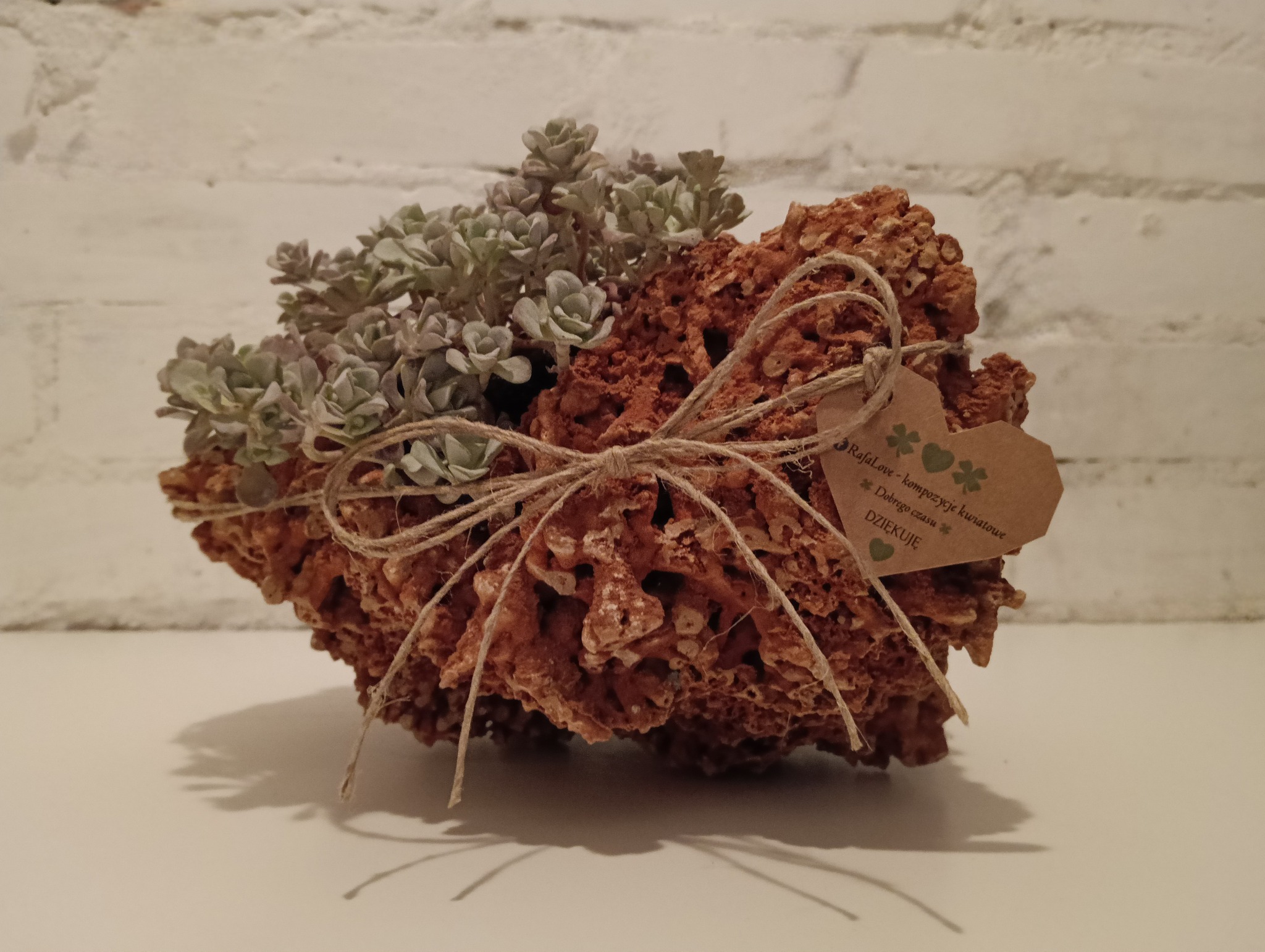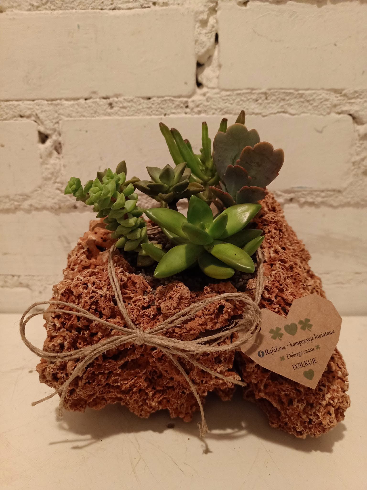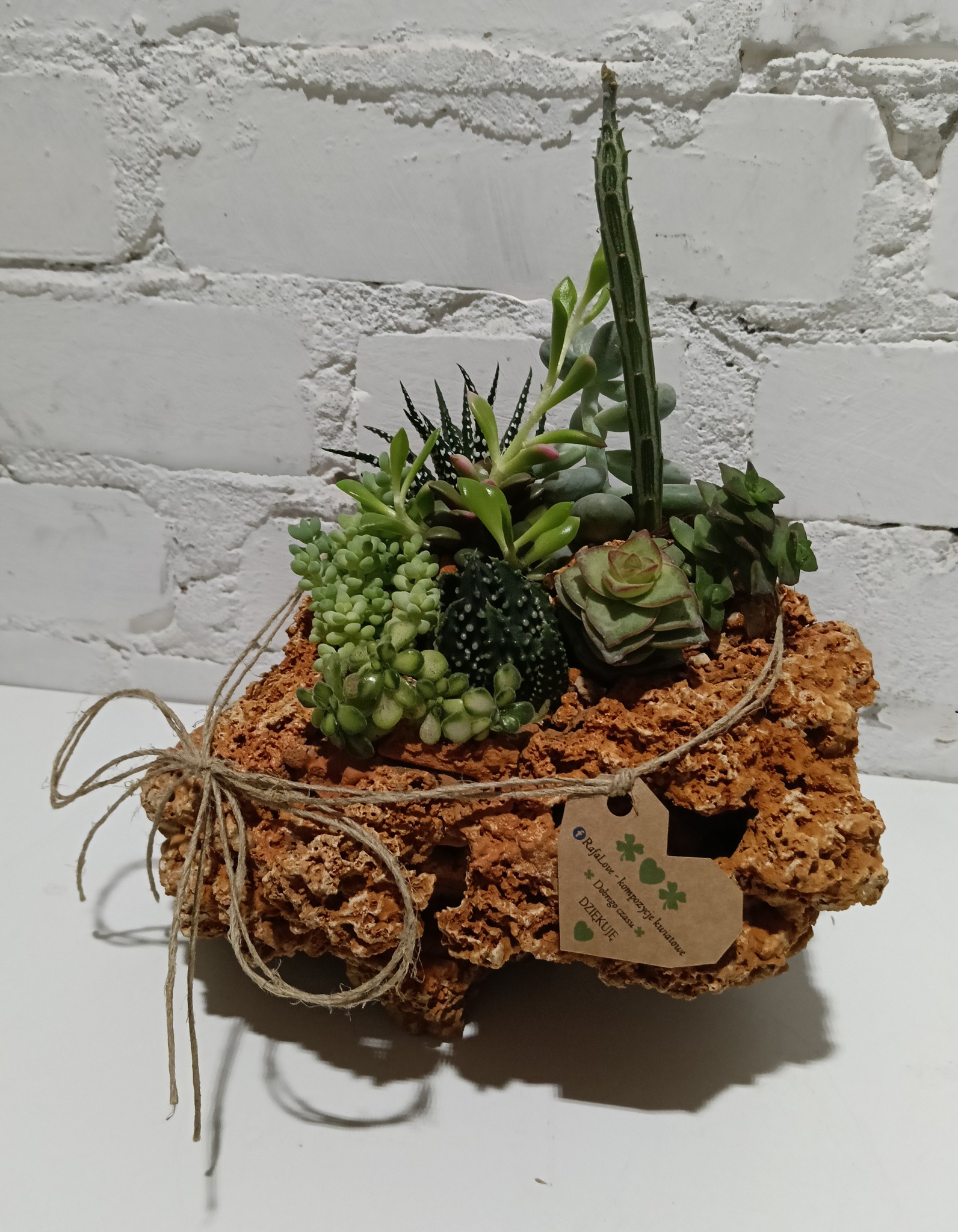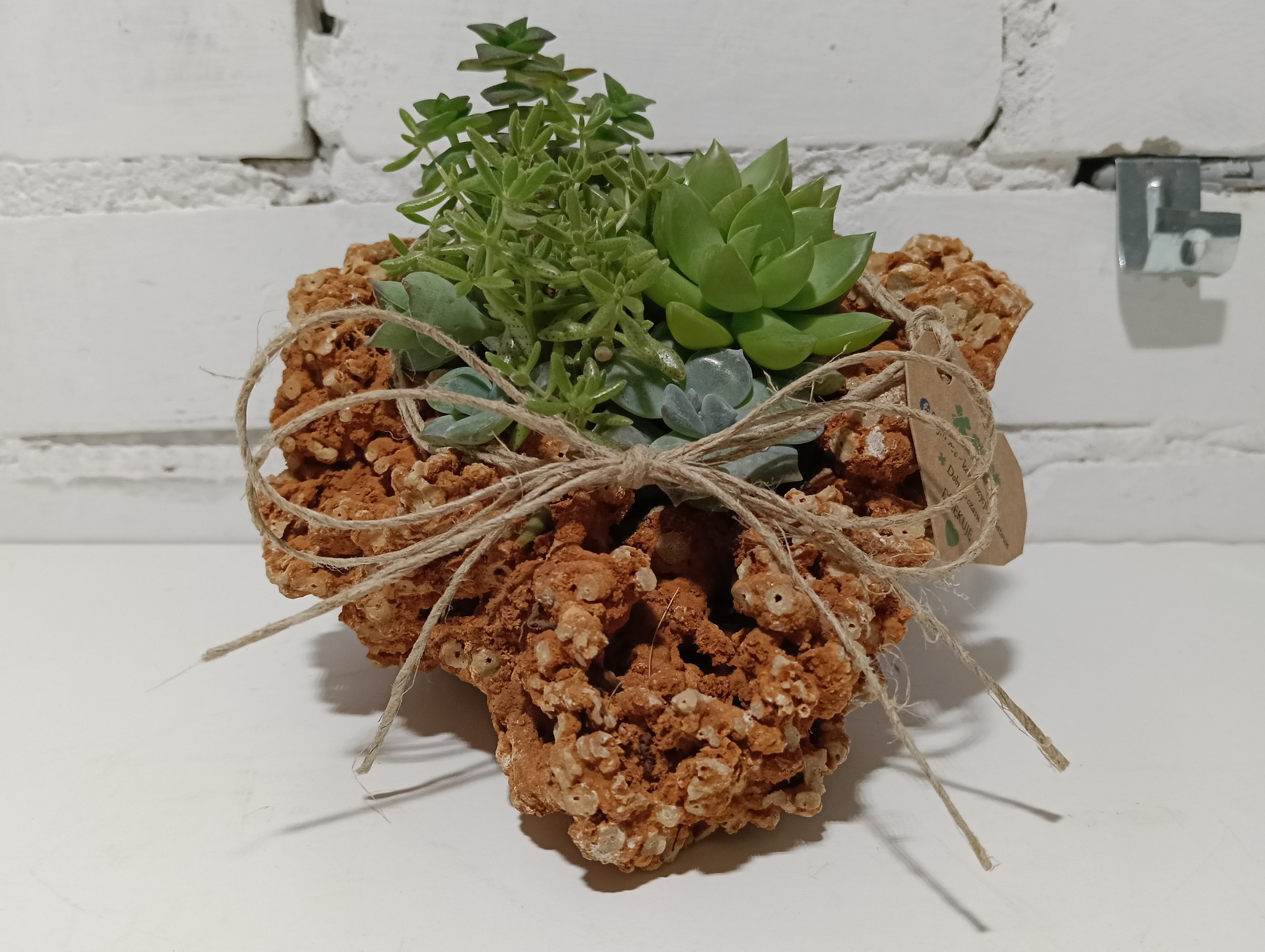 Kompozycje w wapieniu łączą jasne, naturalne struktury kamienia z subtelną zielenią sukulentów, tworząc harmonijny i wyciszający efekt. Porowata faktura wapienia nadaje całości lekkości i organicznego charakteru, a rośliny wkomponowane w jego wnętrze wyglądają jak naturalnie wyrastające z minerału. To dekoracje, które wprowadzają do przestrzeni spokój, światło i delikatną elegancję.